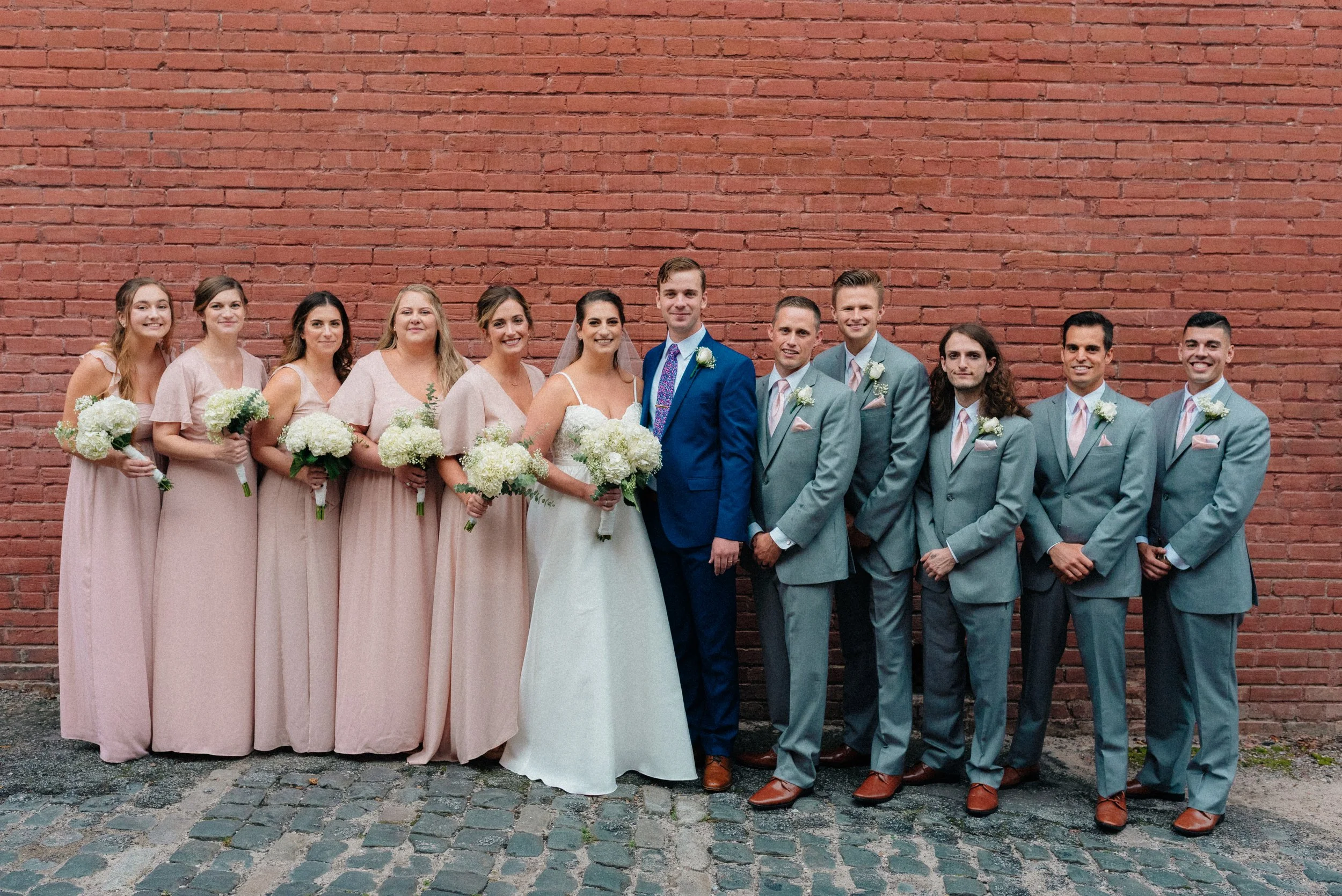 A wedding party poses in front of a brick wall. The bride is in a white dress, the groom in a blue suit. Bridesmaids wear matching pink dresses, holding white bouquets. Groomsmen are in gray suits with pink ties and boutonnieres. View fullsize