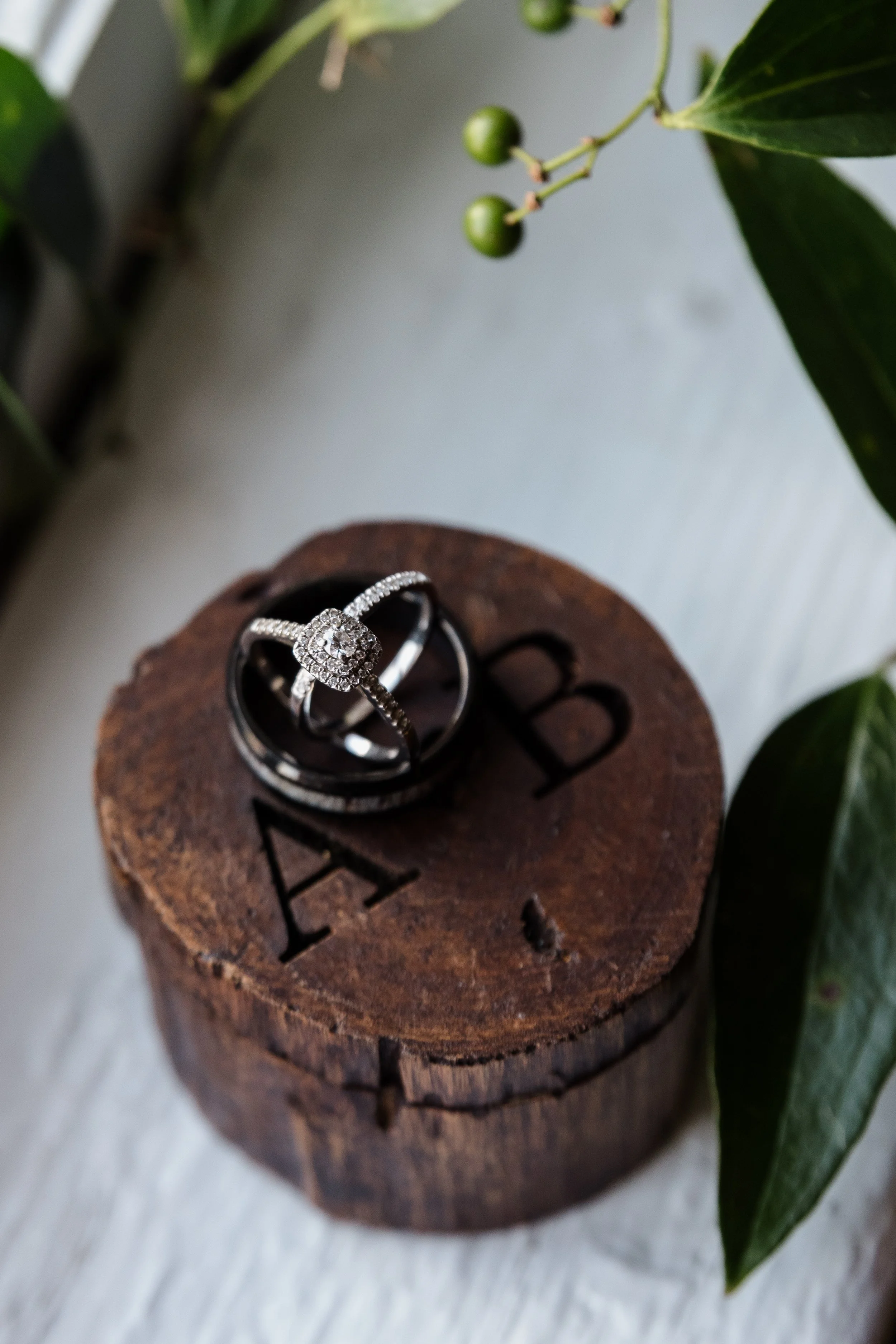 Two wedding rings on a wooden base engraved with "A B," surrounded by green leaves. View fullsize