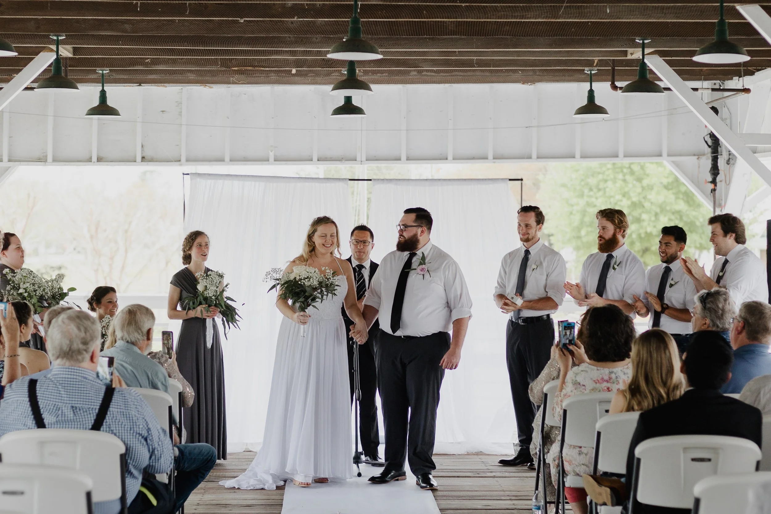 Wedding ceremony with bride and groom walking down the aisle, surrounded by bridesmaids and groomsmen, guests capturing the moment with phones.