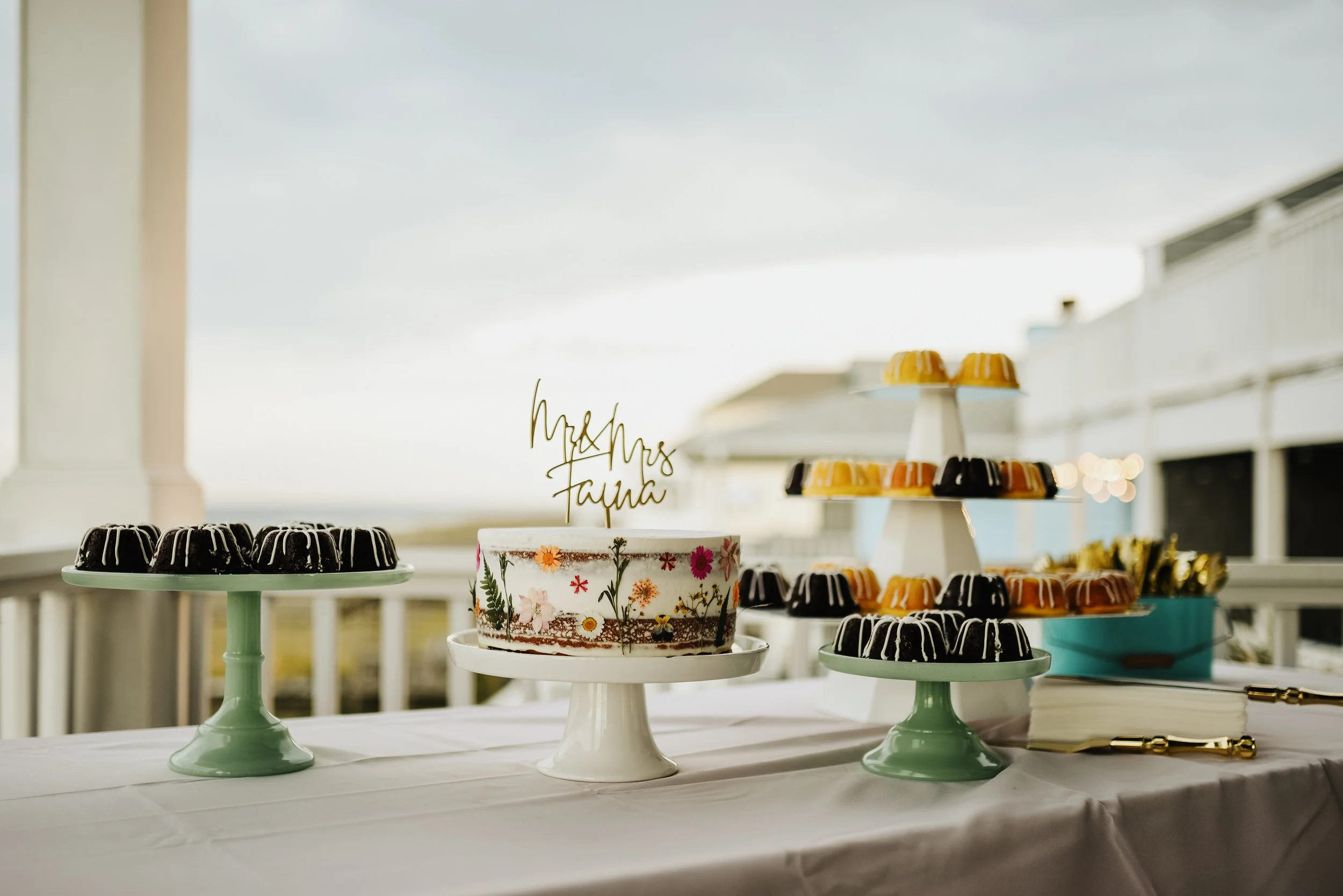 Outdoor wedding dessert table with a floral-decorated cake labeled 'Mr & Mrs', surrounded by assorted bundt cakes on stands. View fullsize