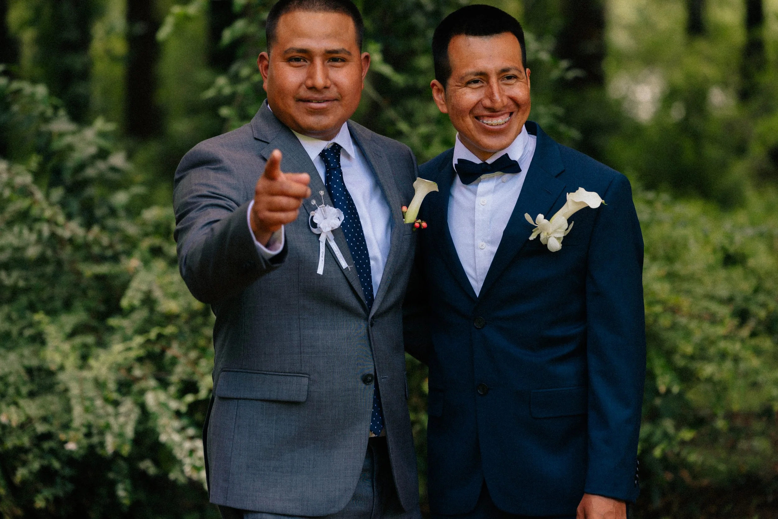 Two men in suits posing together outdoors, one pointing at the camera, both smiling, with greenery in the background.