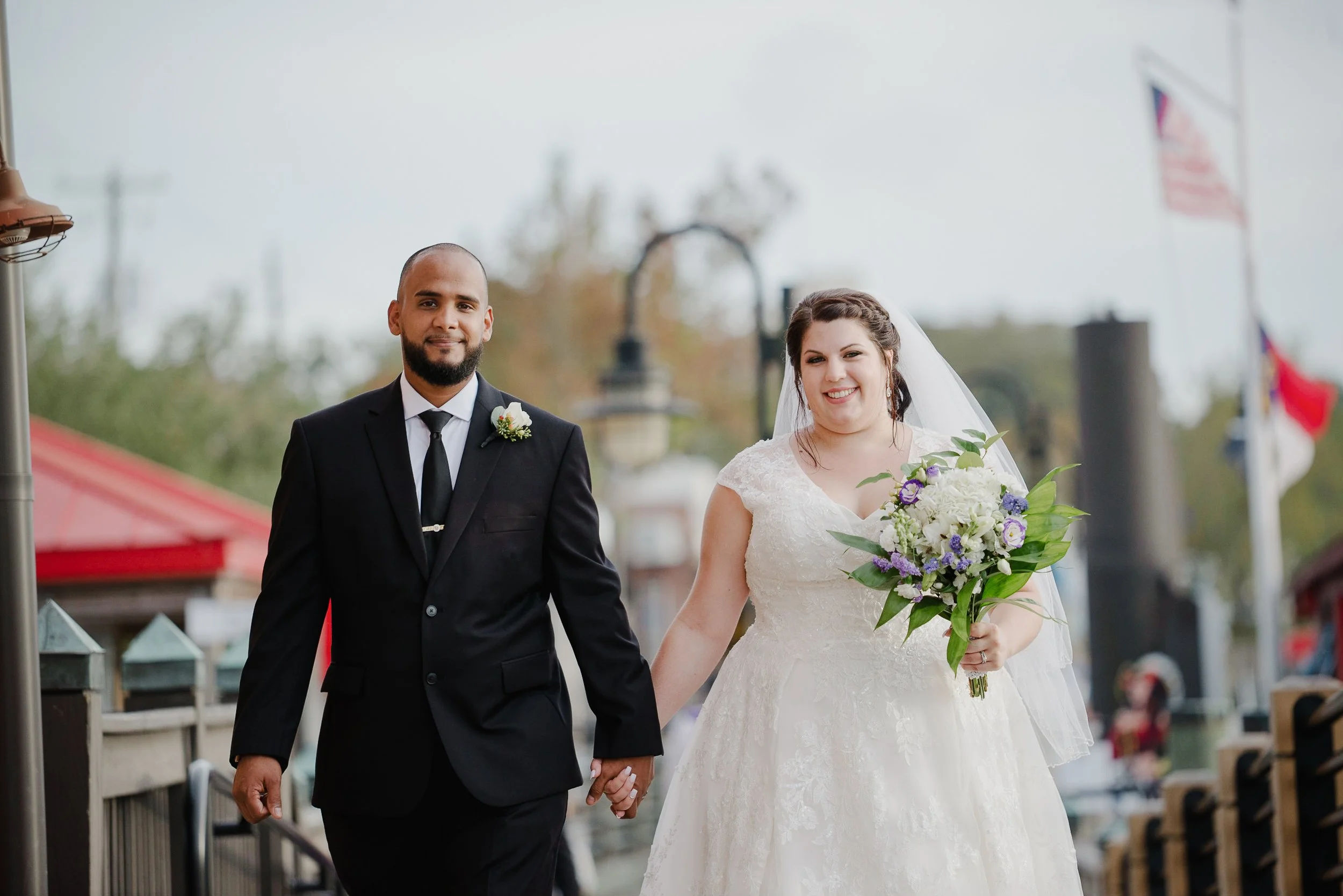 Bride and groom walking on Wilmington Riverwalk boardwalk, holding hands, with river and lampposts in background. View fullsize