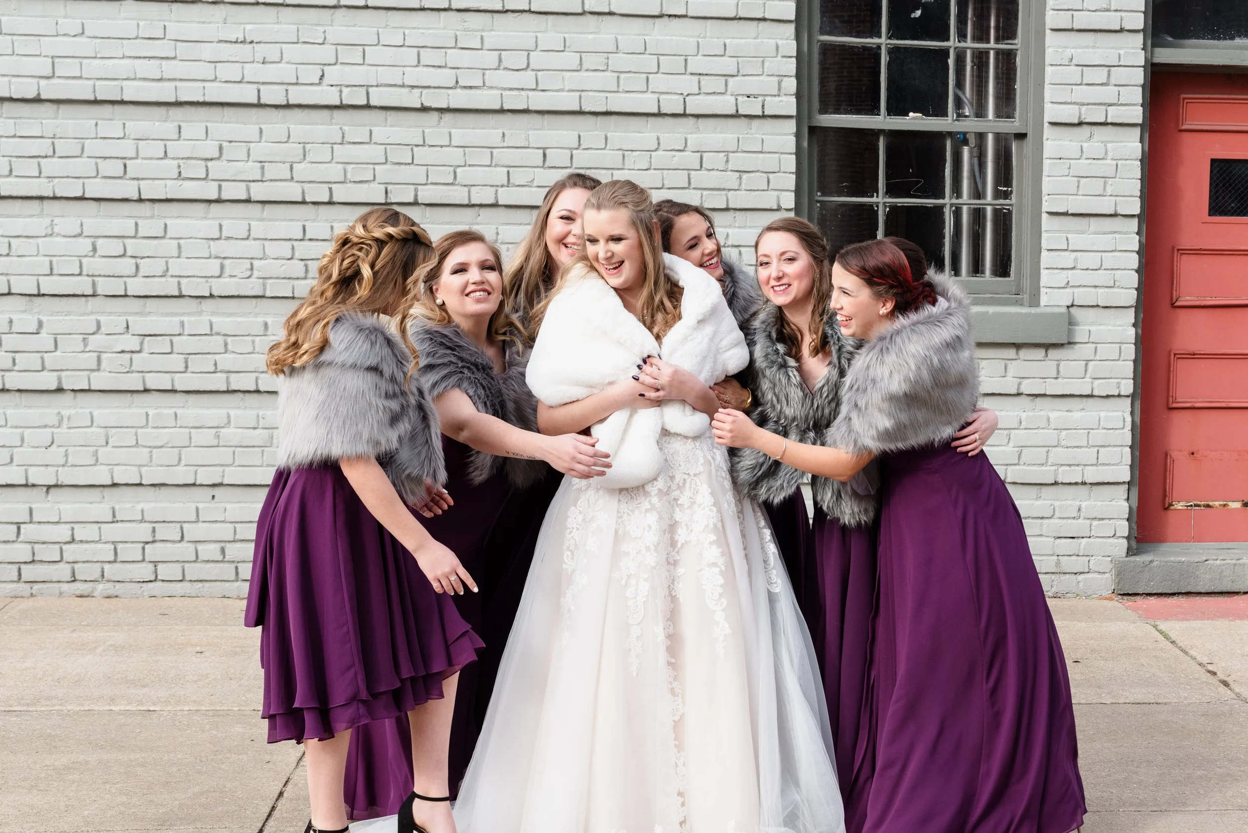 A bride surrounded by bridesmaids in purple dresses and gray faux fur wraps, smiling outdoors against a brick wall backdrop. View fullsize