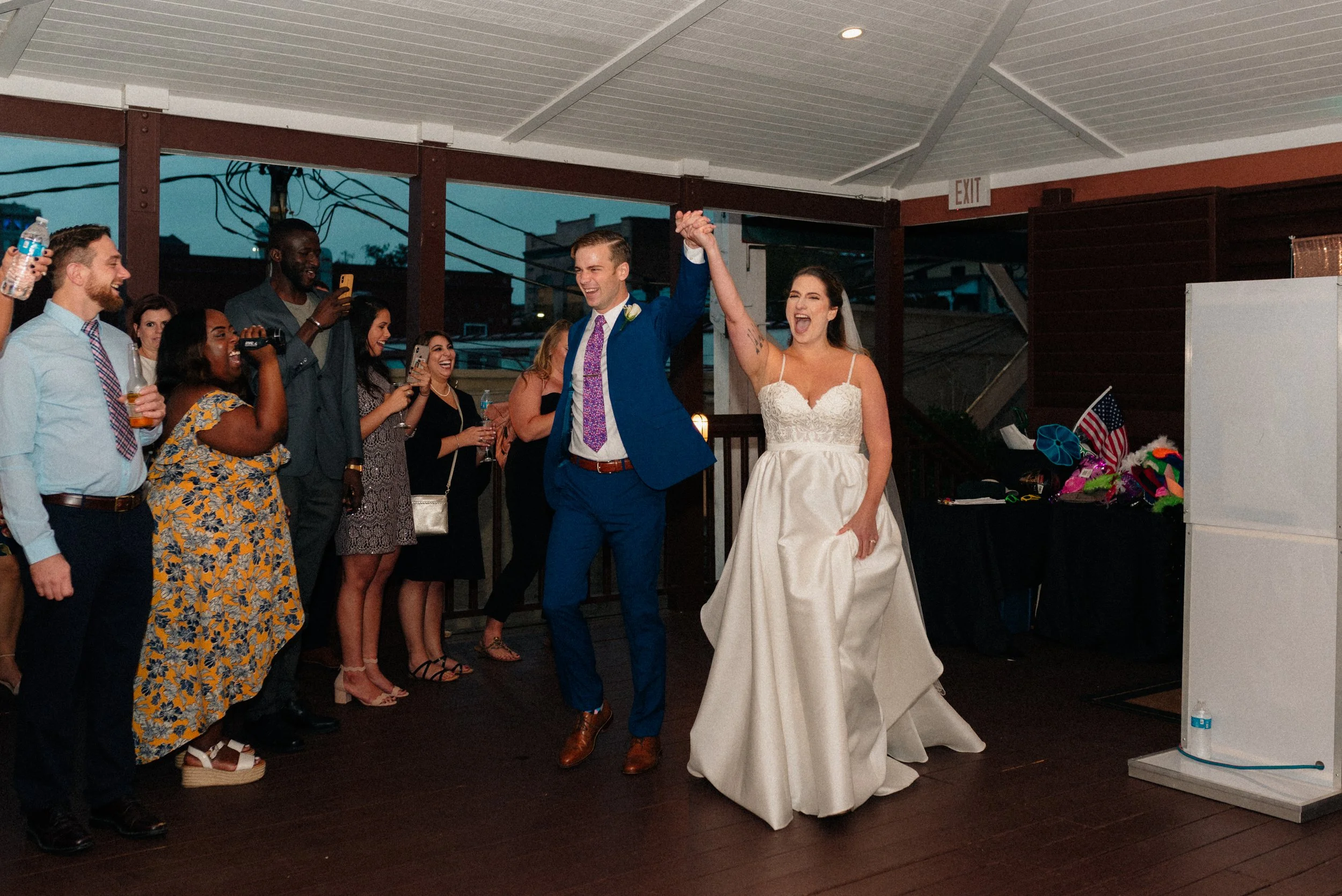 Bride and groom celebrating while holding hands at a wedding reception, surrounded by cheering guests. View fullsize