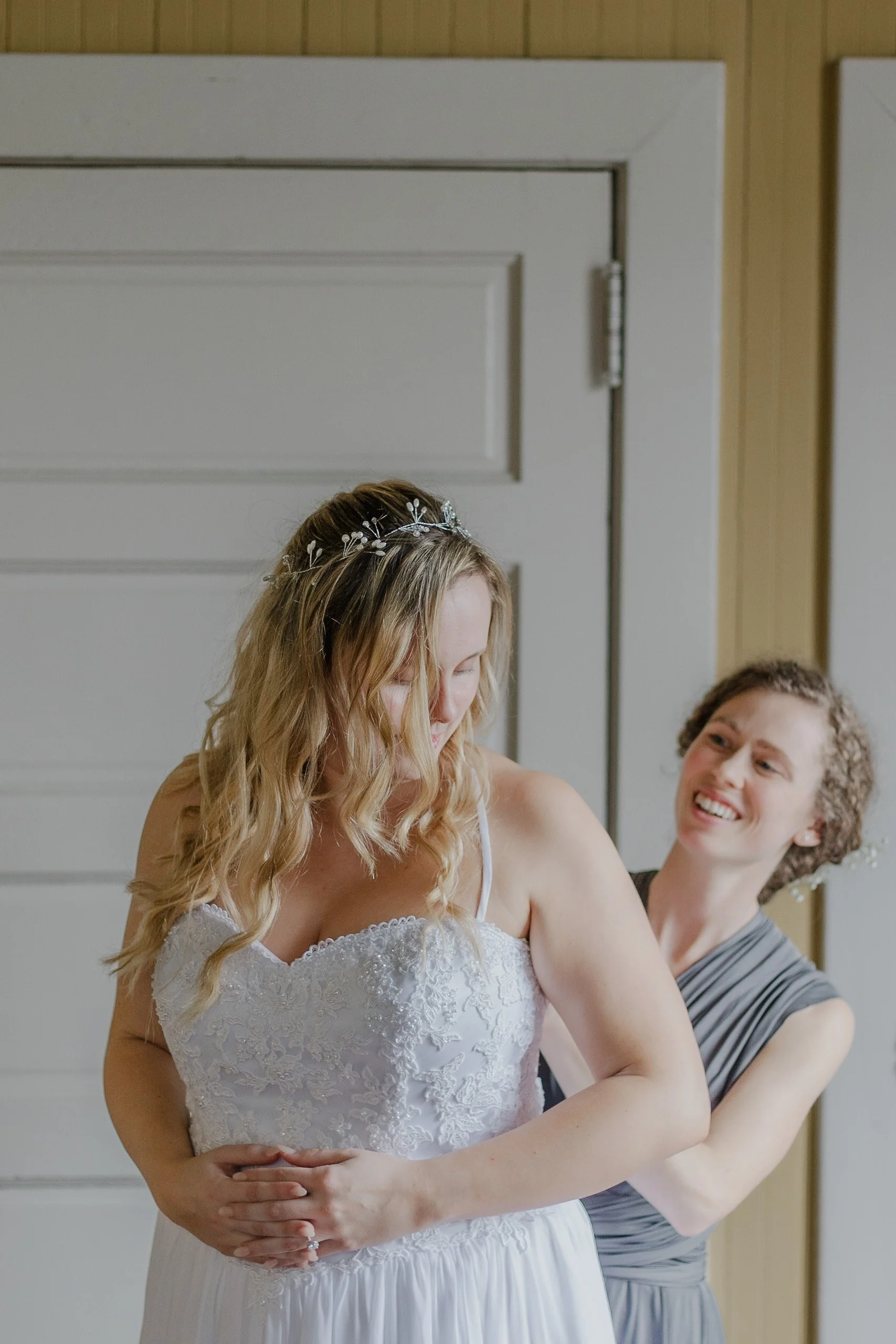 Bride getting ready with bridesmaid's help, wearing a white wedding dress and floral headpiece.