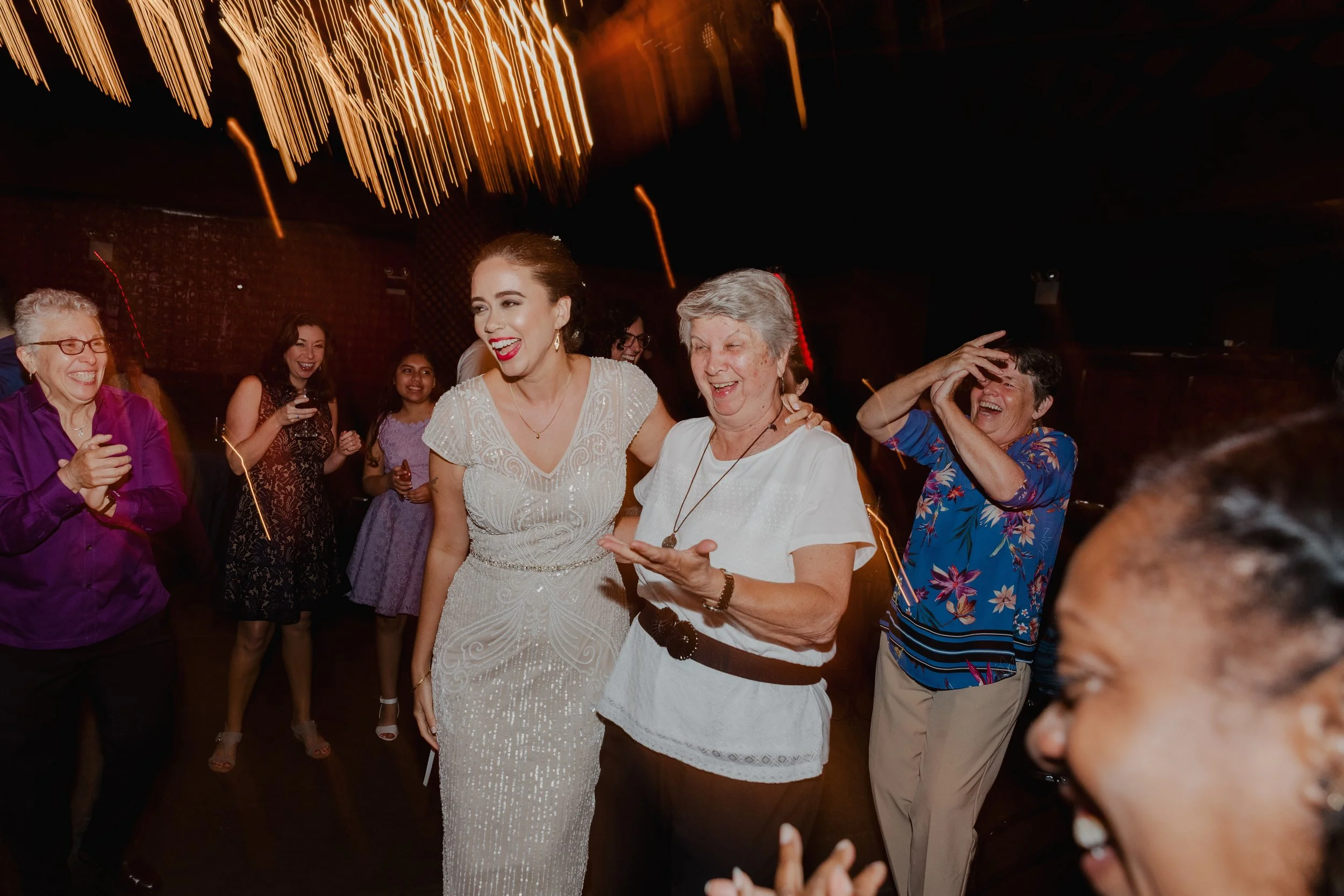 A joyful group of people dancing at a celebration, with one woman in an elegant dress leading the group. Colored lights create a festive atmosphere. View fullsize