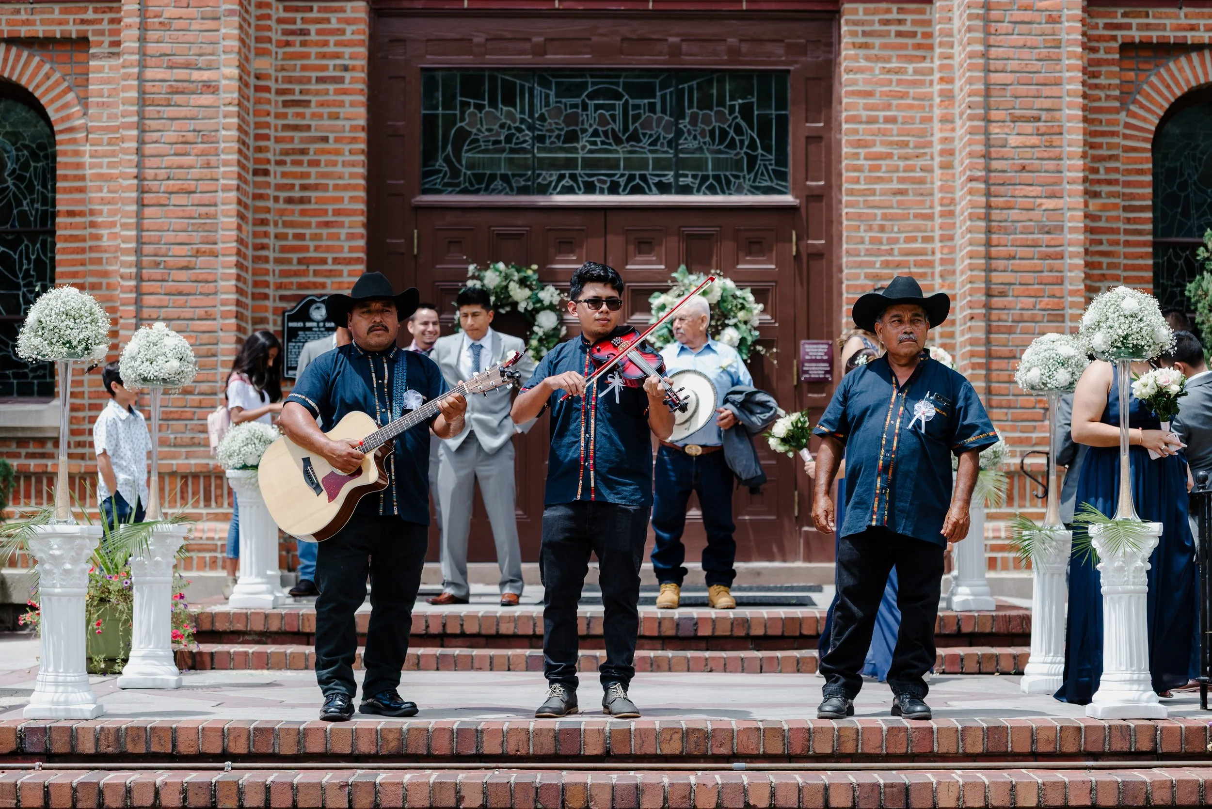 Mariachi band playing outside a church with wedding decorations