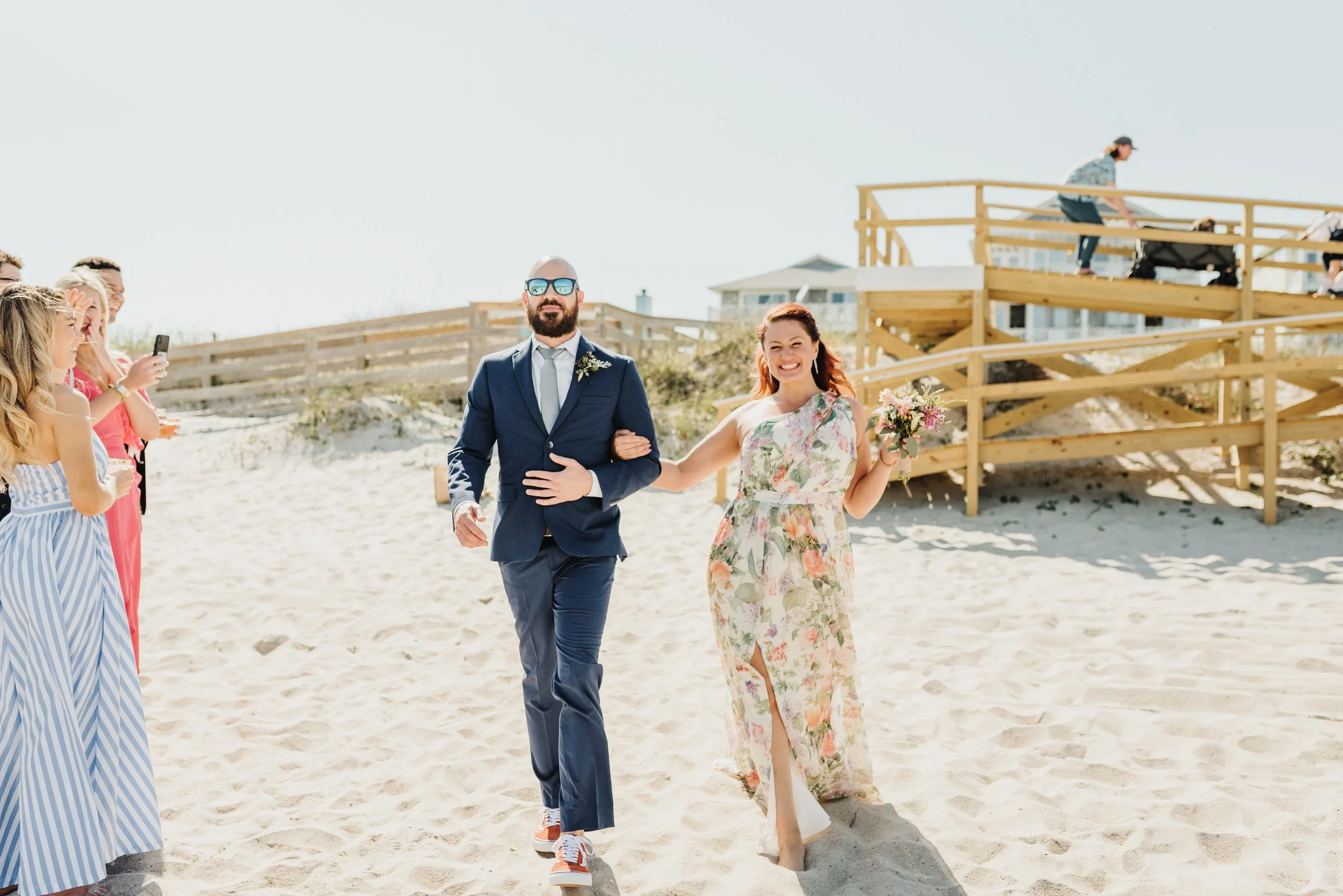 A couple in formal attire walking arm in arm on a sandy beach. The man is wearing a blue suit and sunglasses, while the woman is in a floral dress holding a bouquet. Onlookers in colorful outfits are taking photos. A boardwalk and a person pushing a View fullsize
