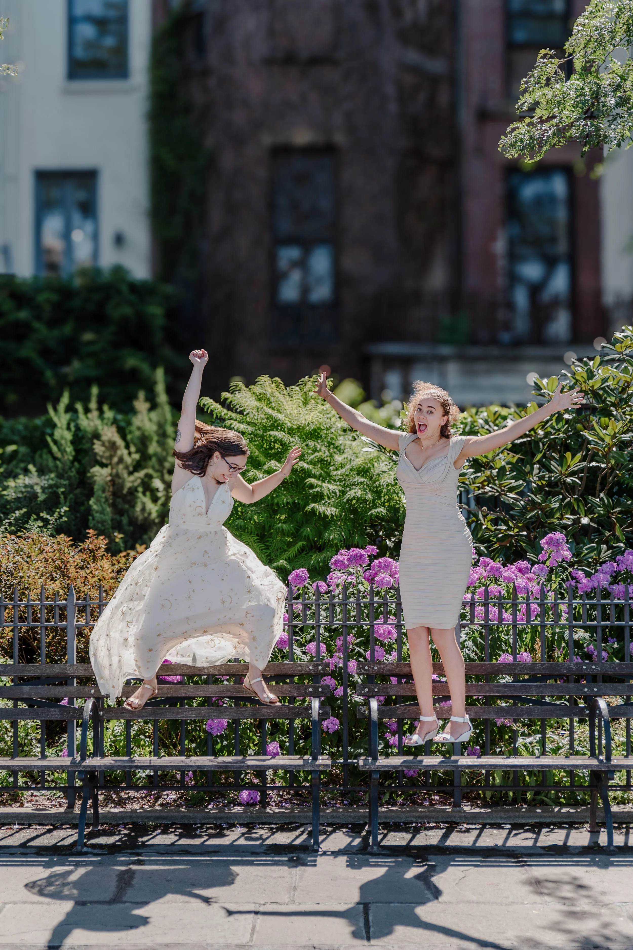 Bride and bridesmaid walking, bride in a white gown, bridesmaid in a pink dress, outside on a sidewalk. View fullsize