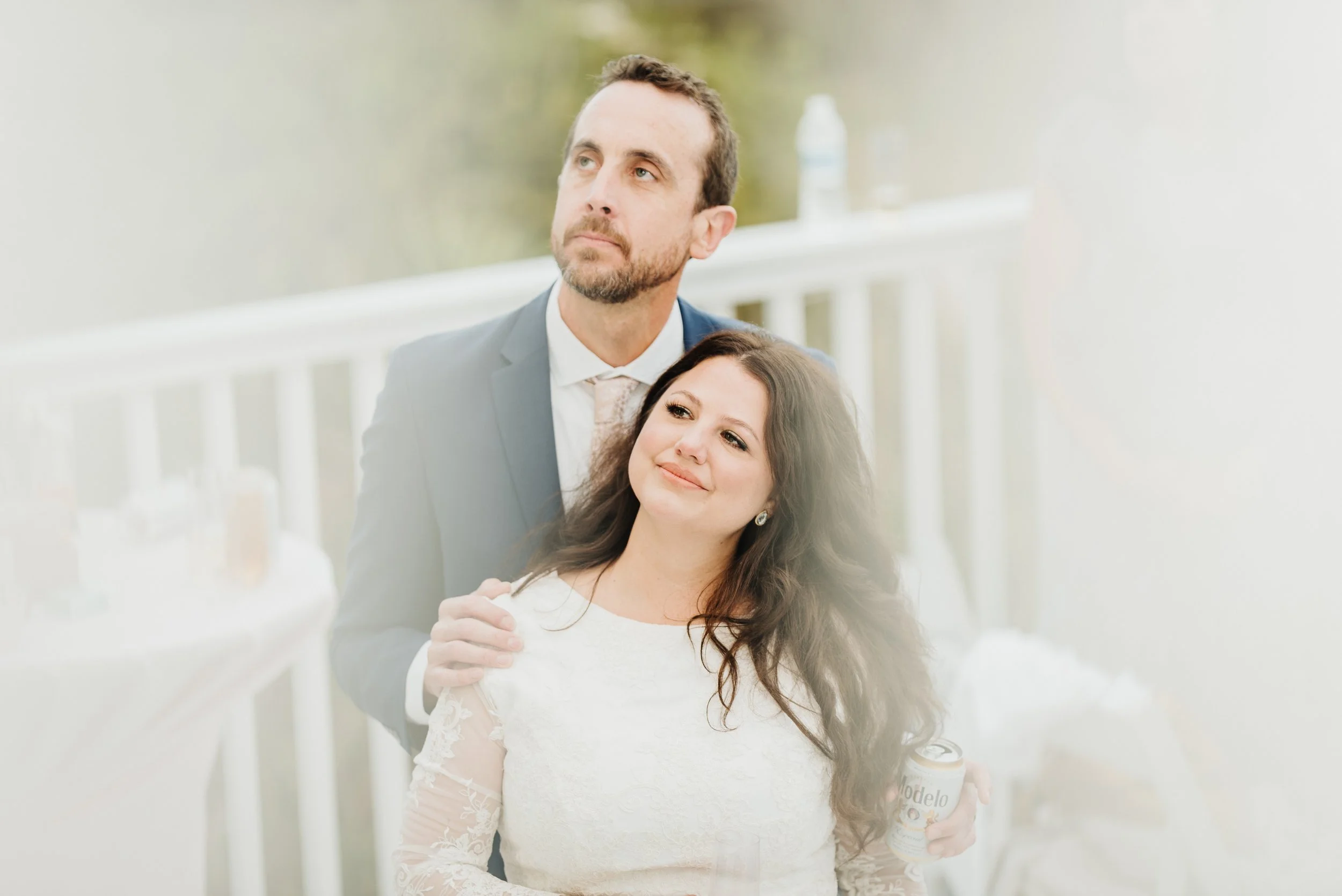 A couple at an outdoor event, woman in a white dress holding a Modelo beer can, man in a suit standing behind her, resting his hand on her shoulder. View fullsize