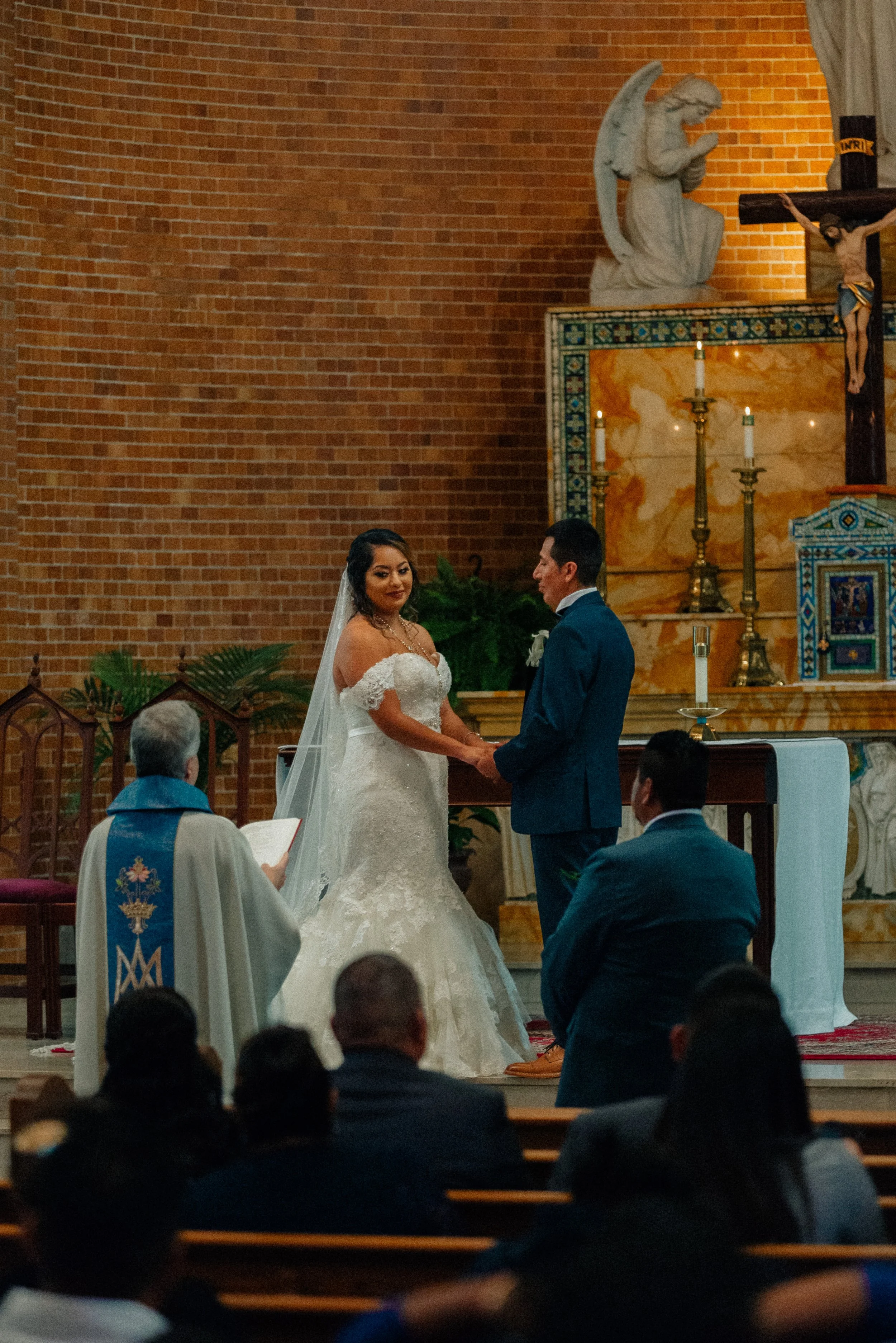 A couple exchanging vows during a church wedding ceremony. The bride wears a white wedding dress and veil, and the groom is in a dark suit. A priest in a blue and white robe conducts the ceremony. The church has a brick wall background with religious