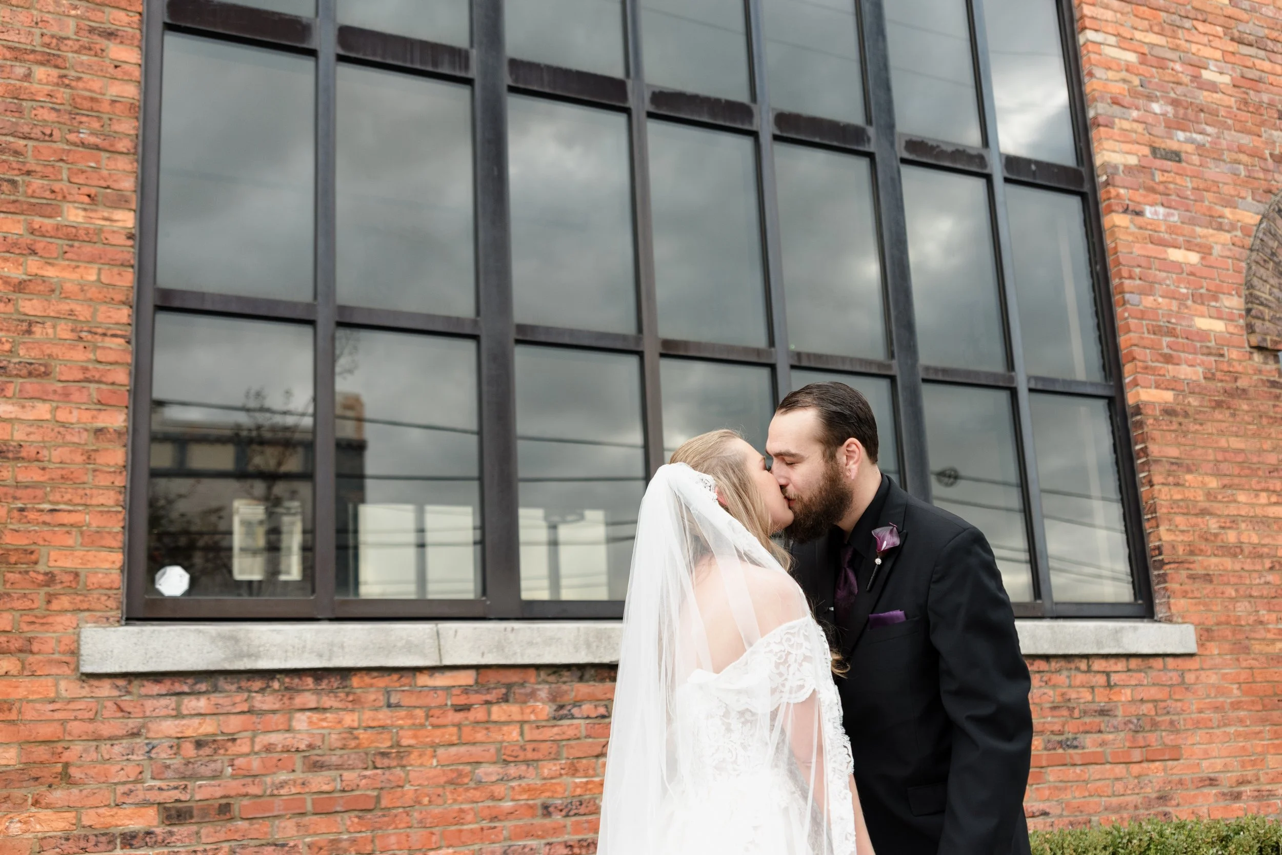 Wedding couple kissing outside a brick building with large windows. View fullsize