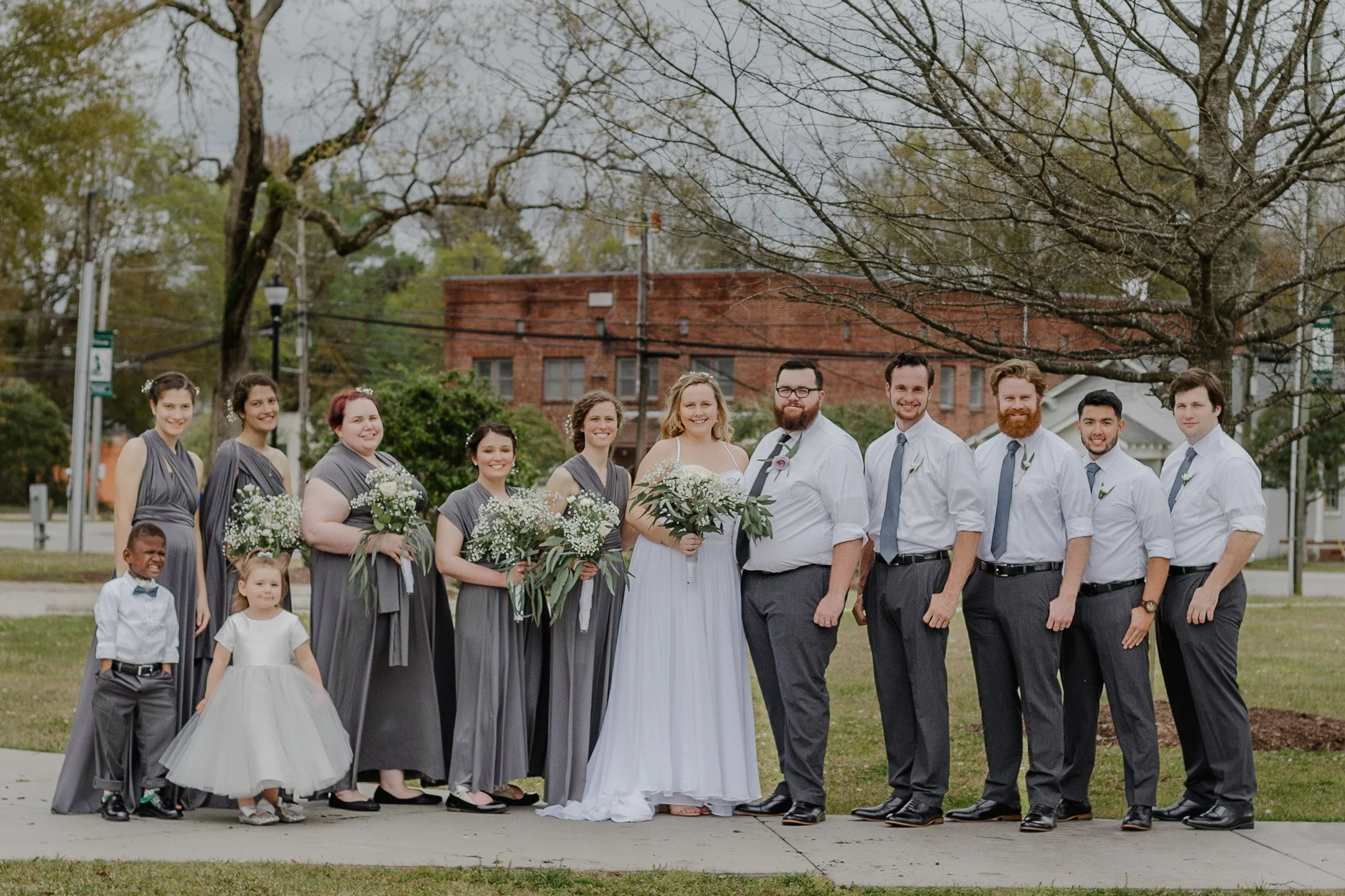 Wedding party posing outdoors in formal attire with bridesmaids in gray dresses and groomsmen in white shirts and gray pants; bride and groom at center.