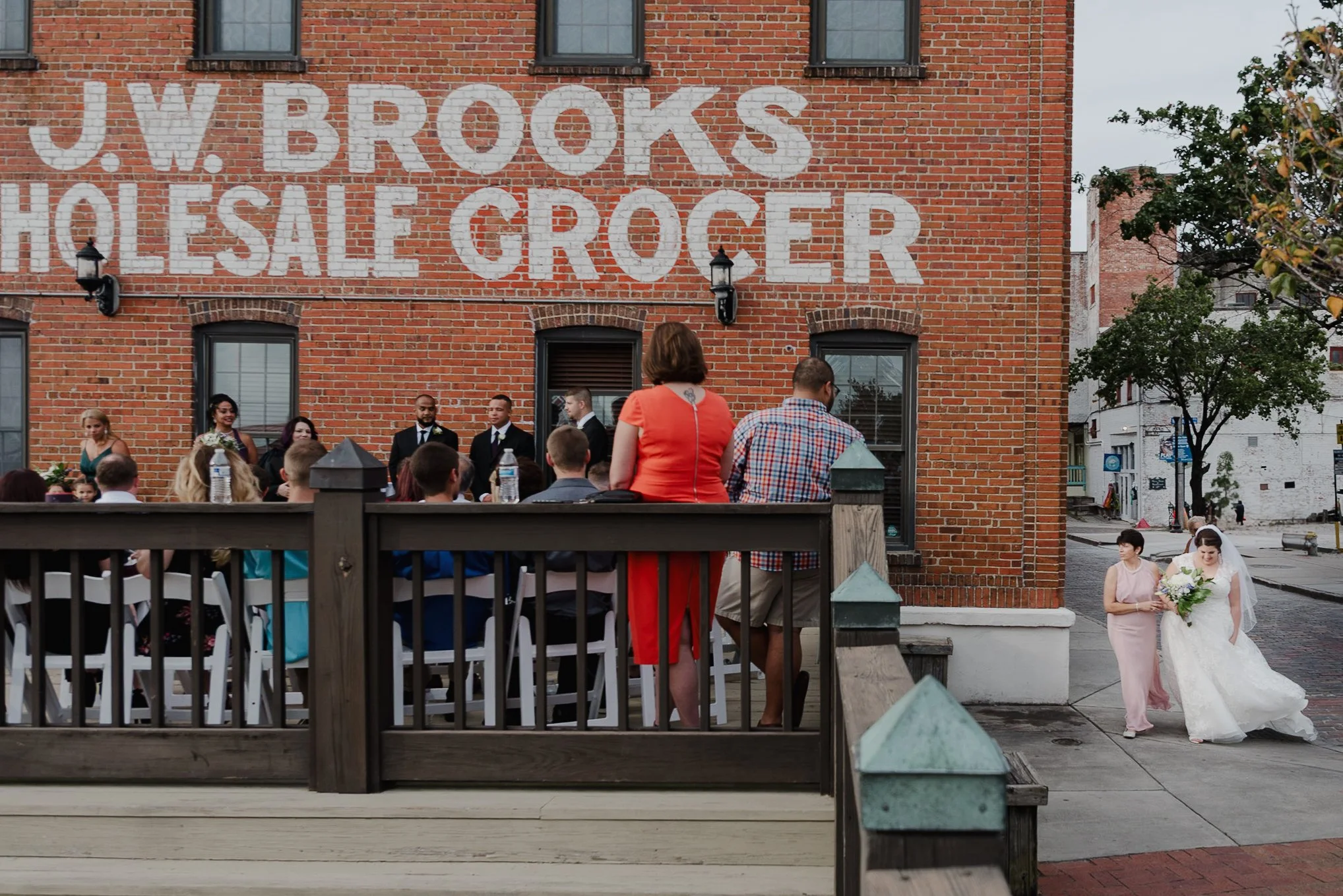 Outdoor wedding ceremony near a brick building with 'J.W. Brooks Wholesale Grocer' sign, showing guests seated, a wedding party, and a bride walking with a bouquet. View fullsize