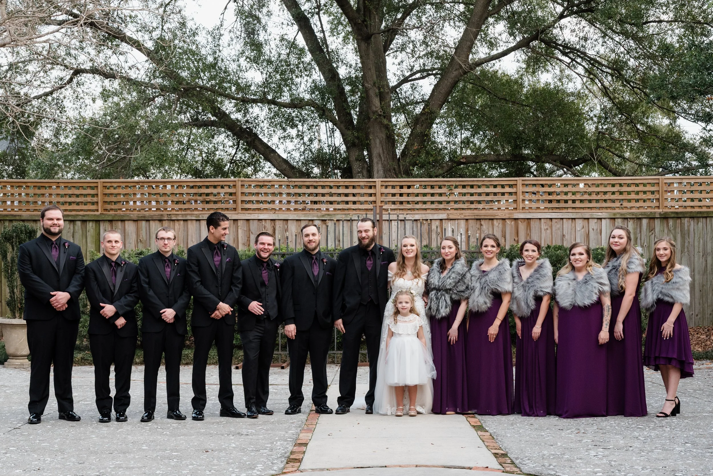 Wedding party group photo with bridesmaids in purple dresses and fur stoles, groomsmen in black suits, outdoors with a wooden fence and trees. View fullsize