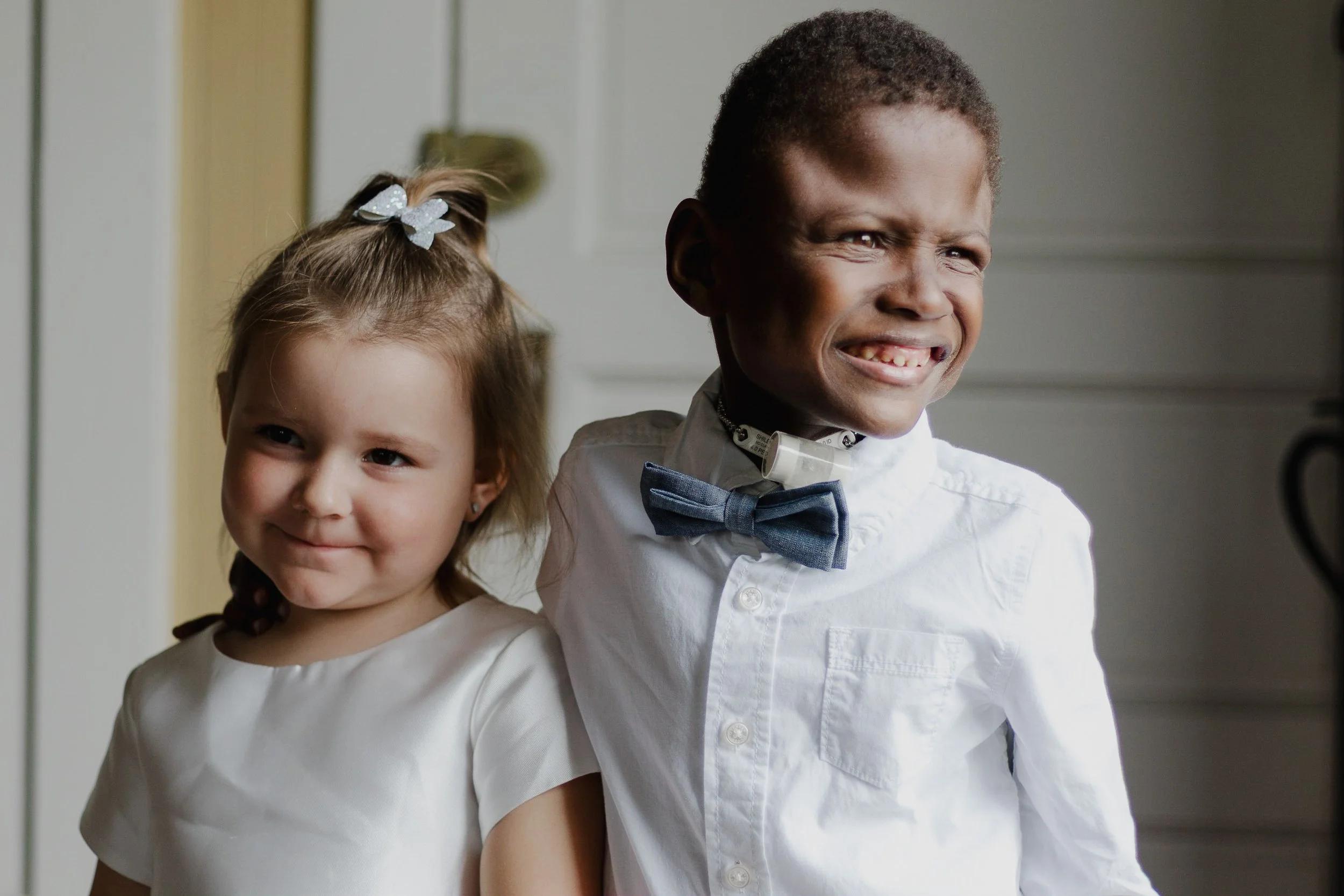 Two children smiling, standing together indoors. The girl has a bow in her hair and wears a white dress, while the boy wears a white shirt and a blue bow tie.