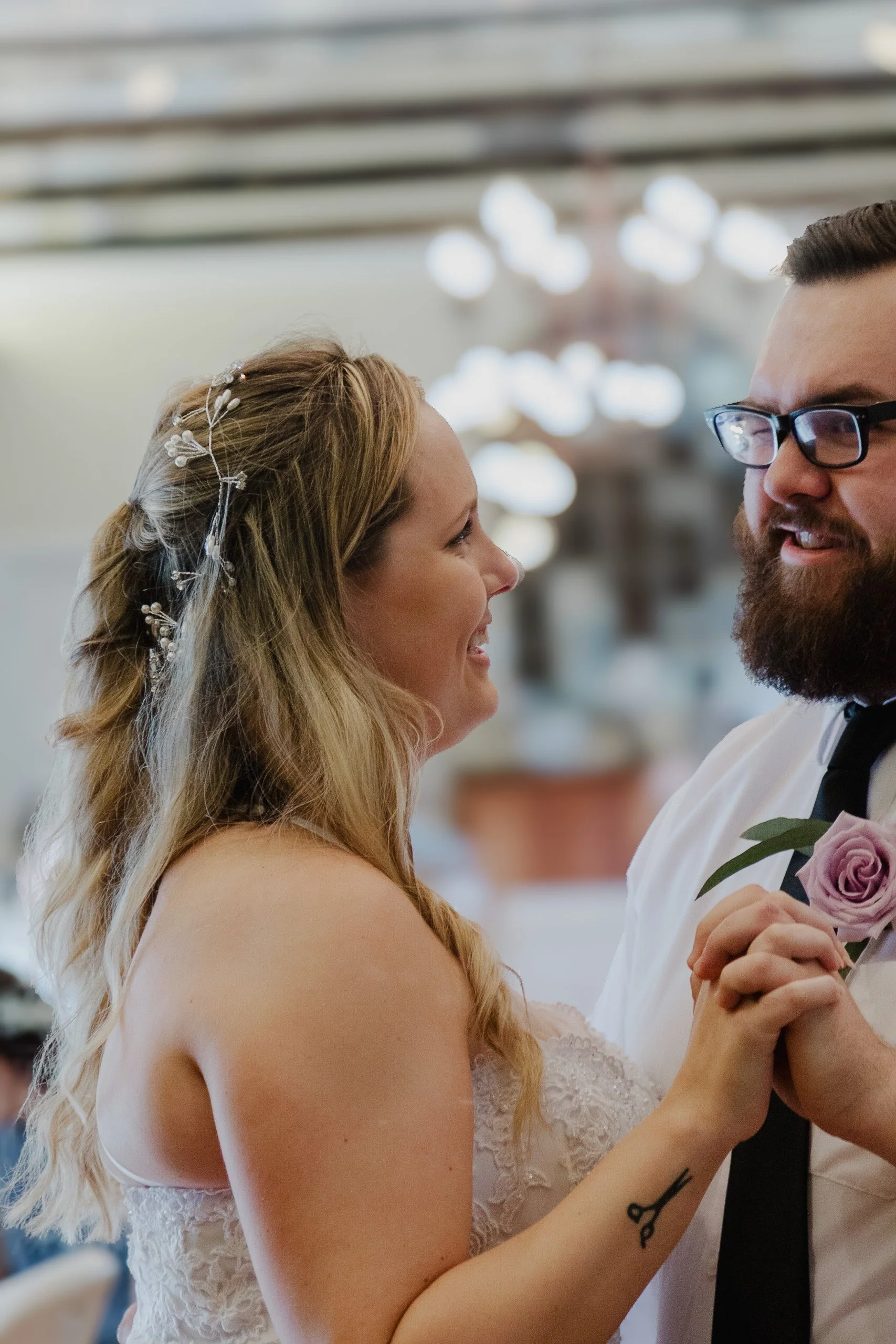 A bride and groom dancing, with the bride in a lace dress and the groom holding a purple rose. They are looking into each other's eyes.