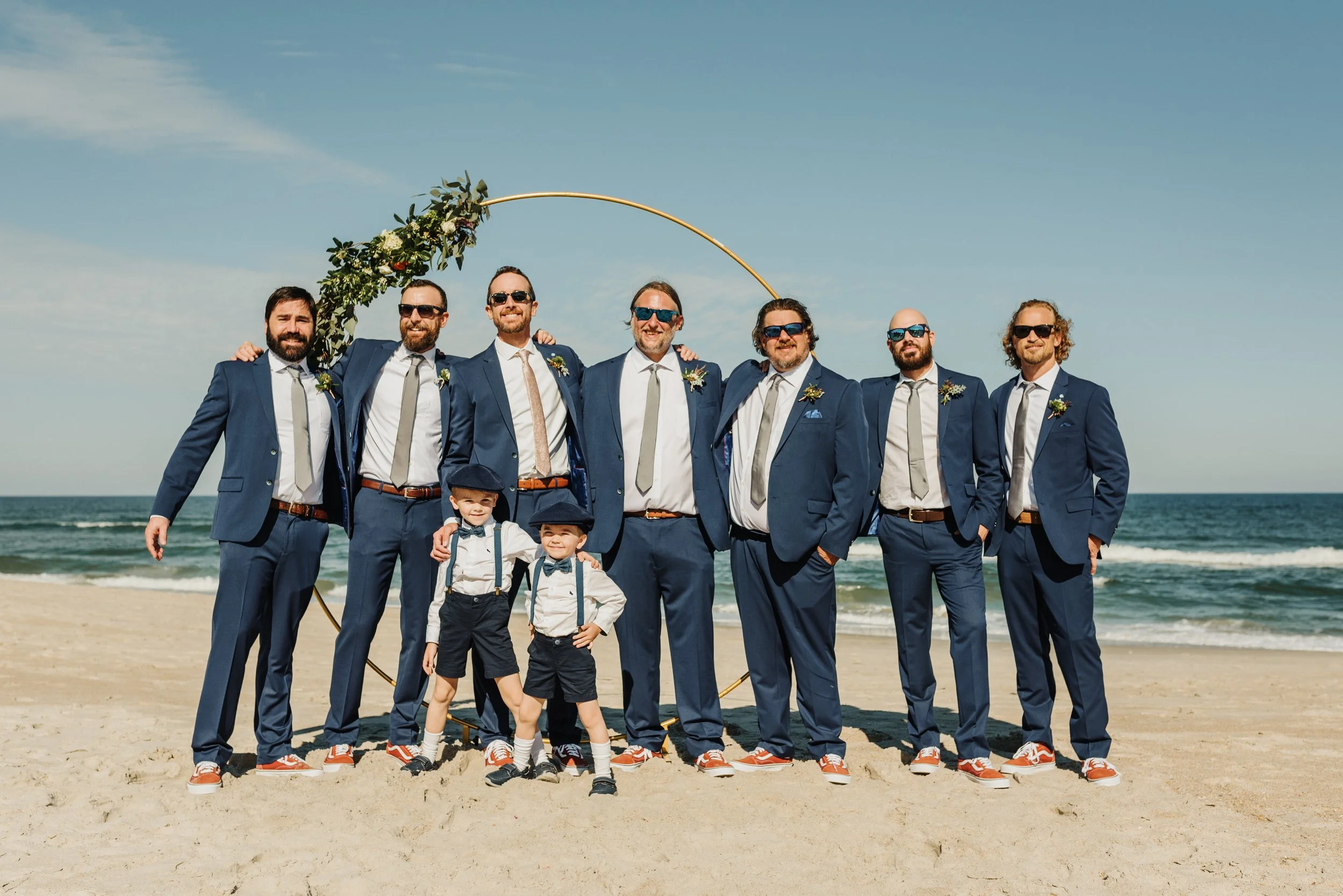 Groomsmen and two children in matching suits standing on a beach, wearing sunglasses, with the ocean in the background. View fullsize