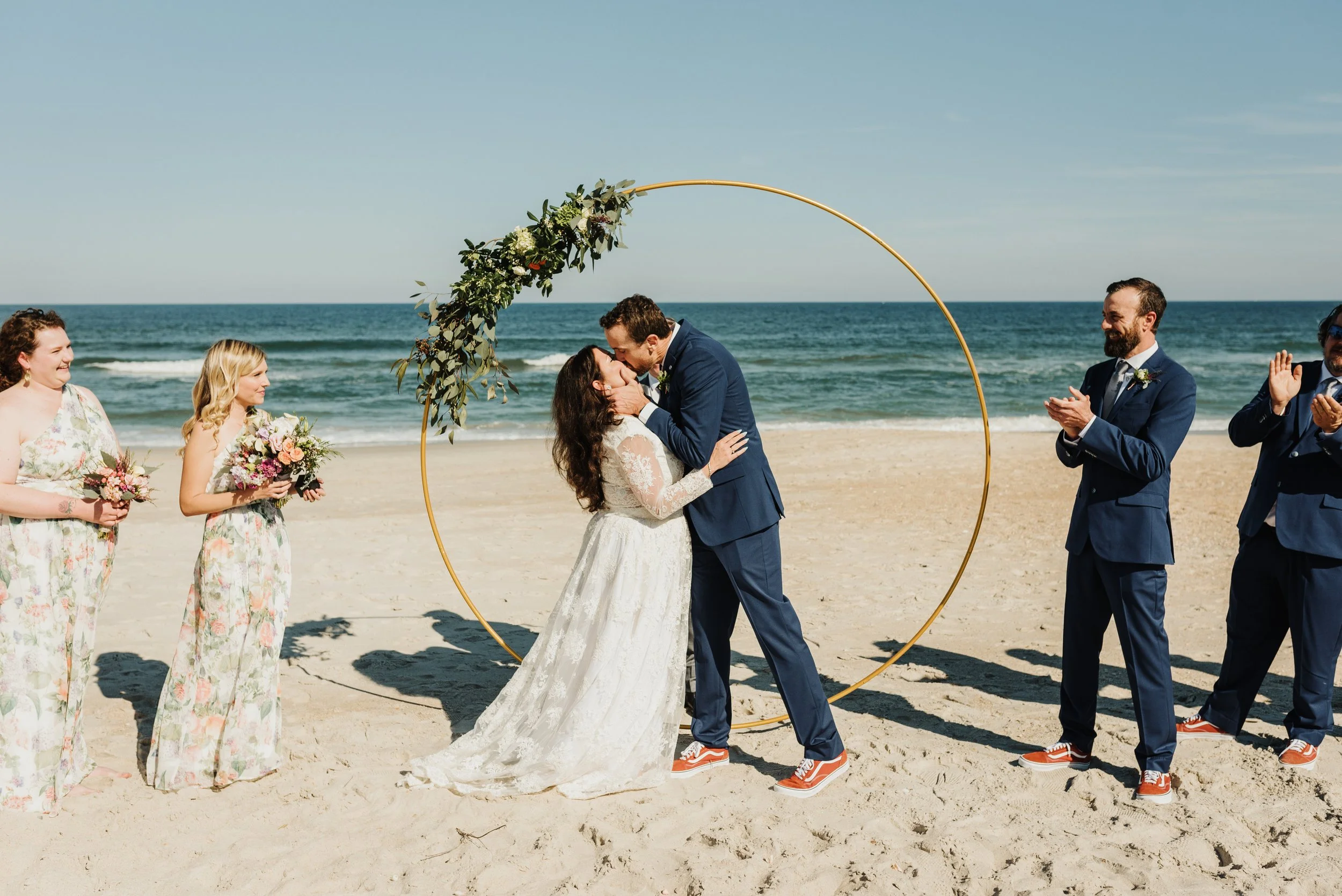 A beach wedding ceremony with a couple kissing under a hoop decorated with greenery, surrounded by bridesmaids in floral dresses and groomsmen in blue suits. View fullsize