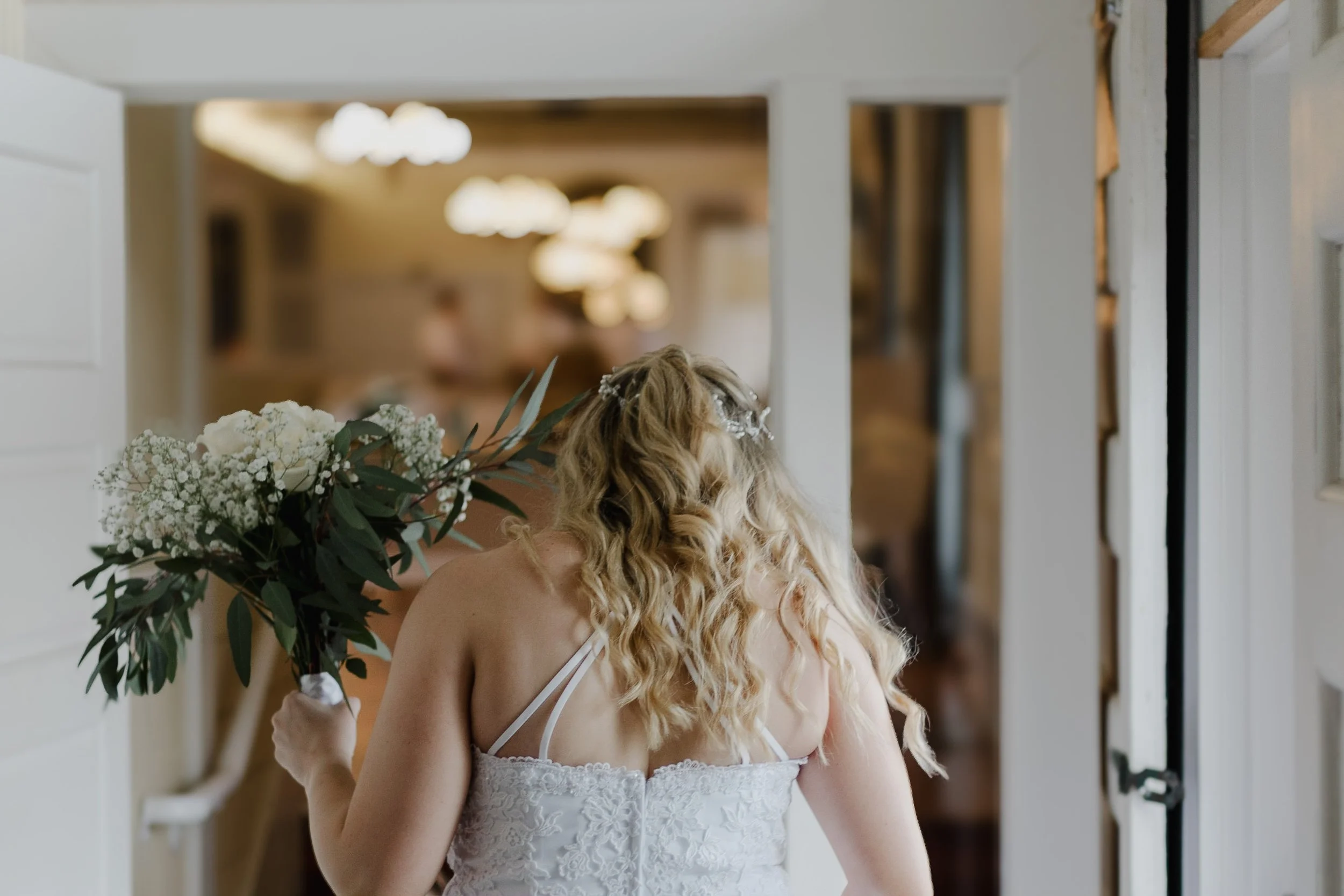 Bride holding a bouquet of white flowers, entering a room with blurred background lighting.