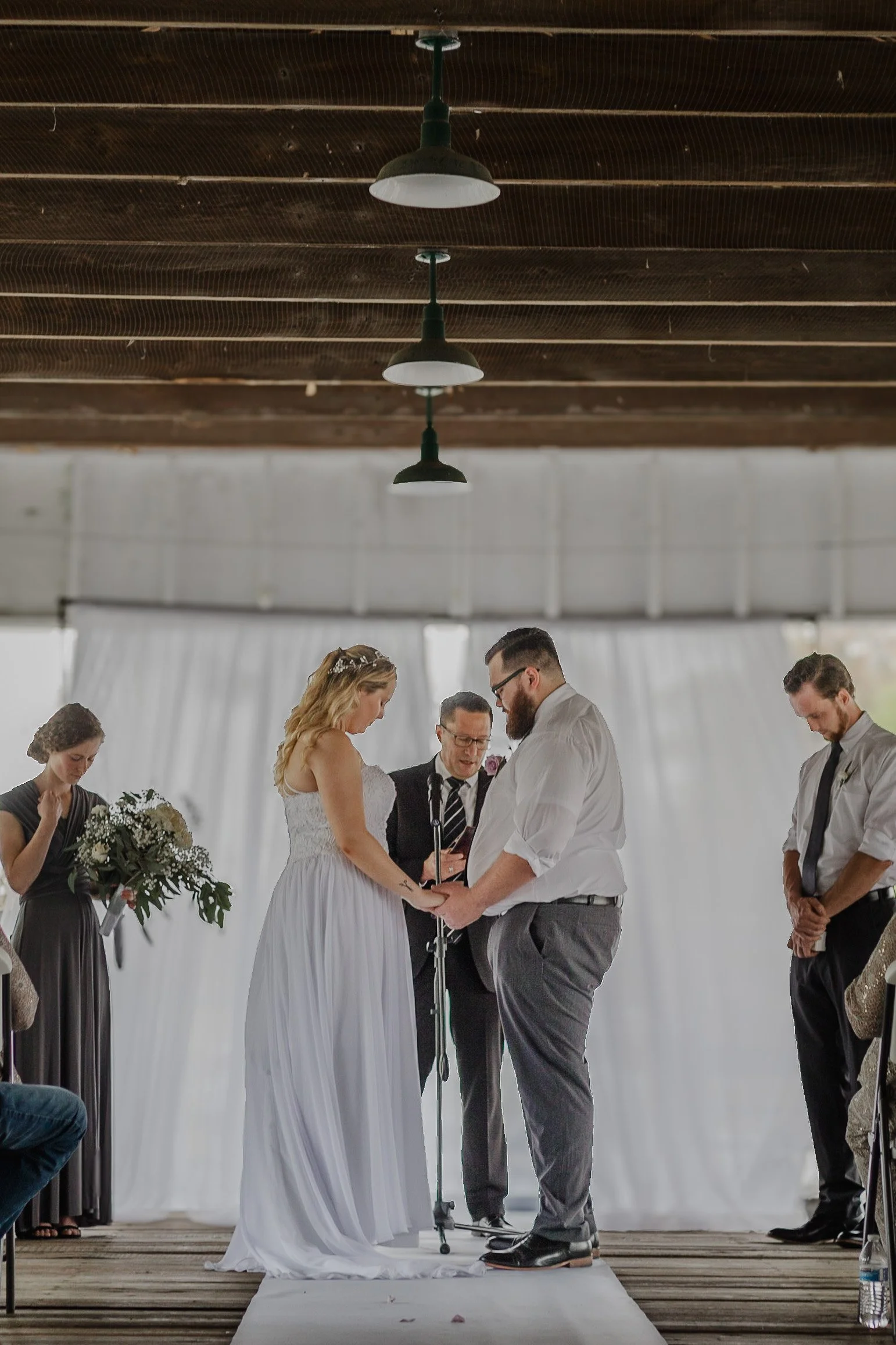 Wedding ceremony with couple holding hands, officiant in the center, bridesmaid holding flowers, and groomsman standing. White backdrop and wooden ceiling visible.