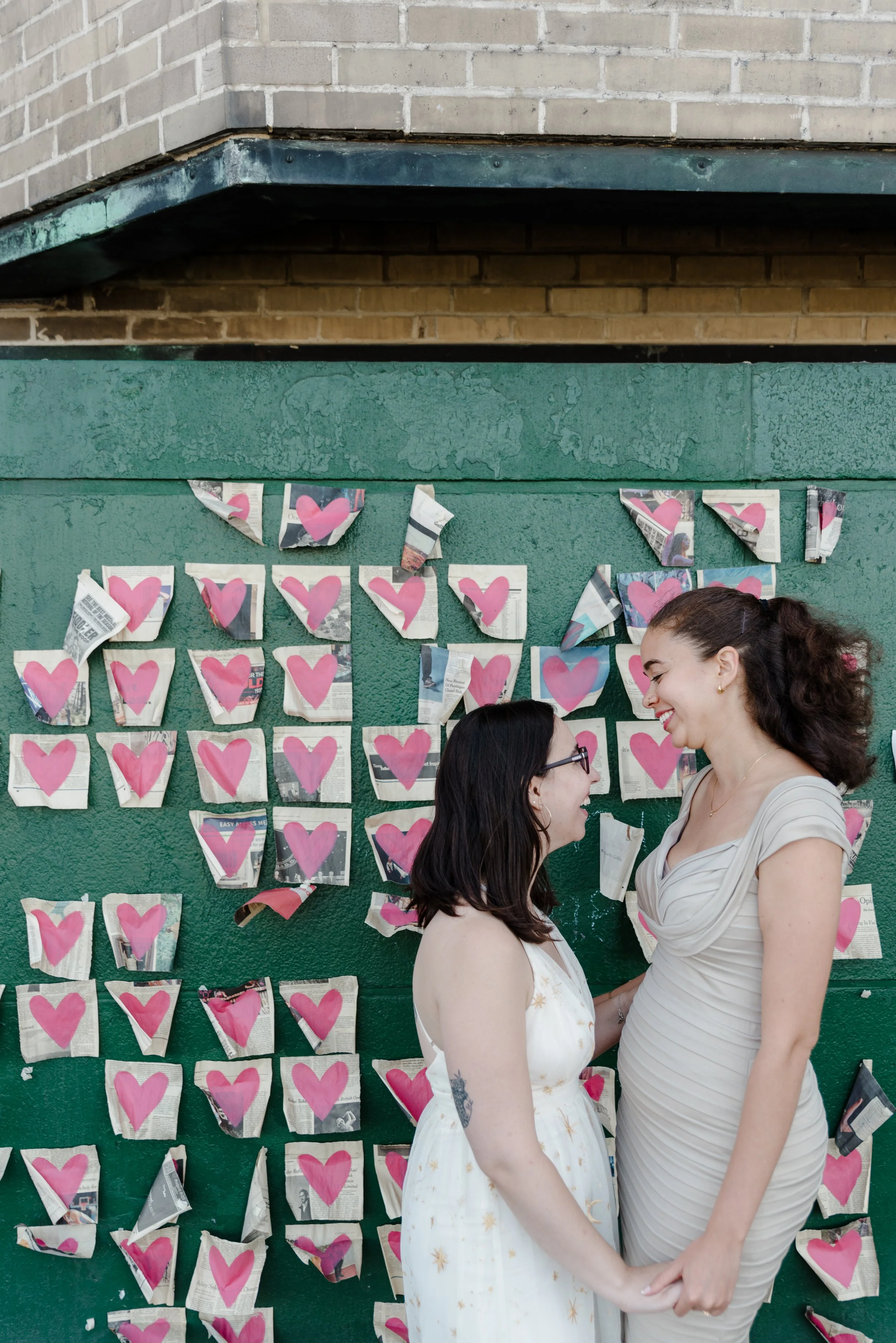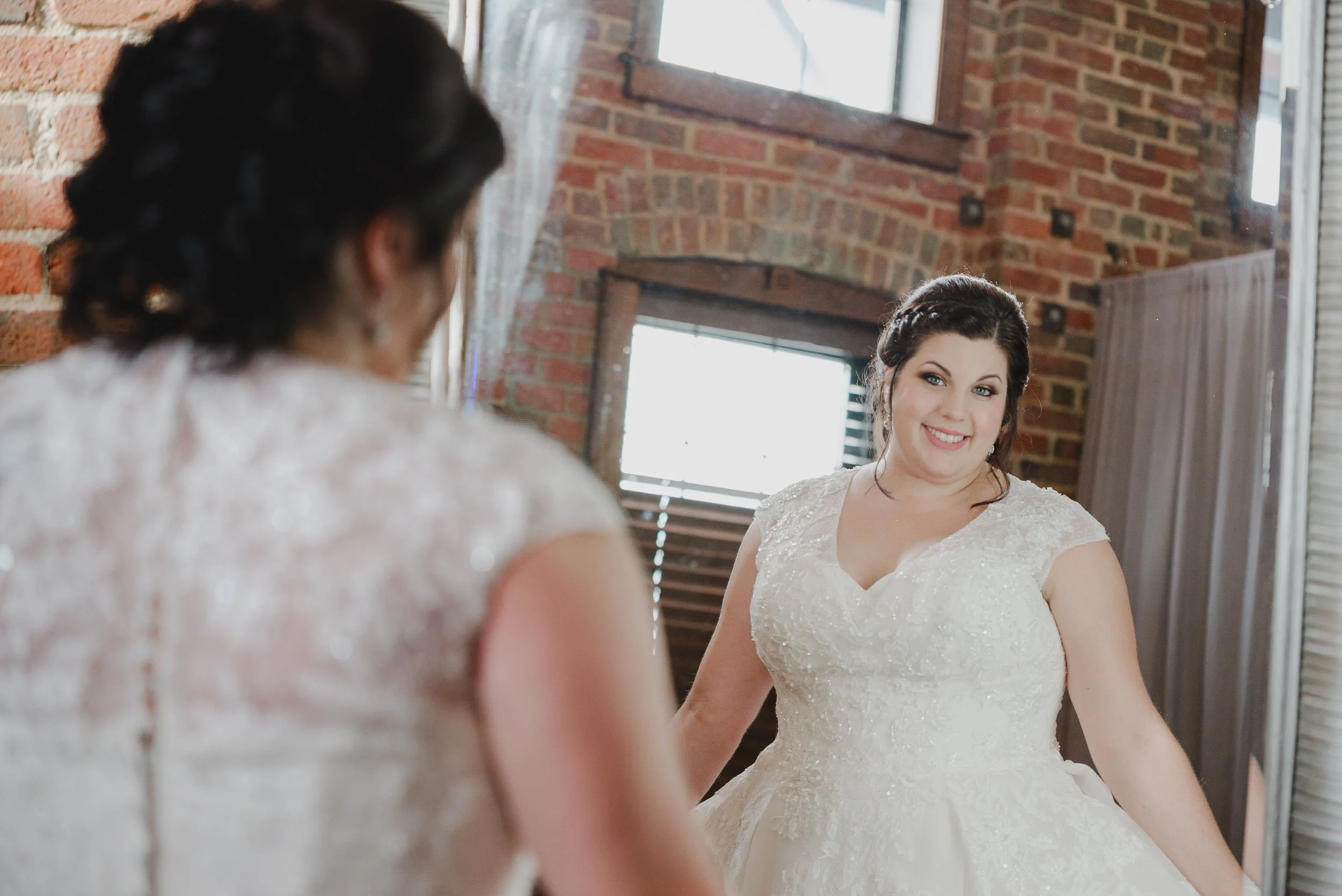 Bride in white wedding dress smiling at her reflection in a mirror, with brick wall and windows in the background. View fullsize