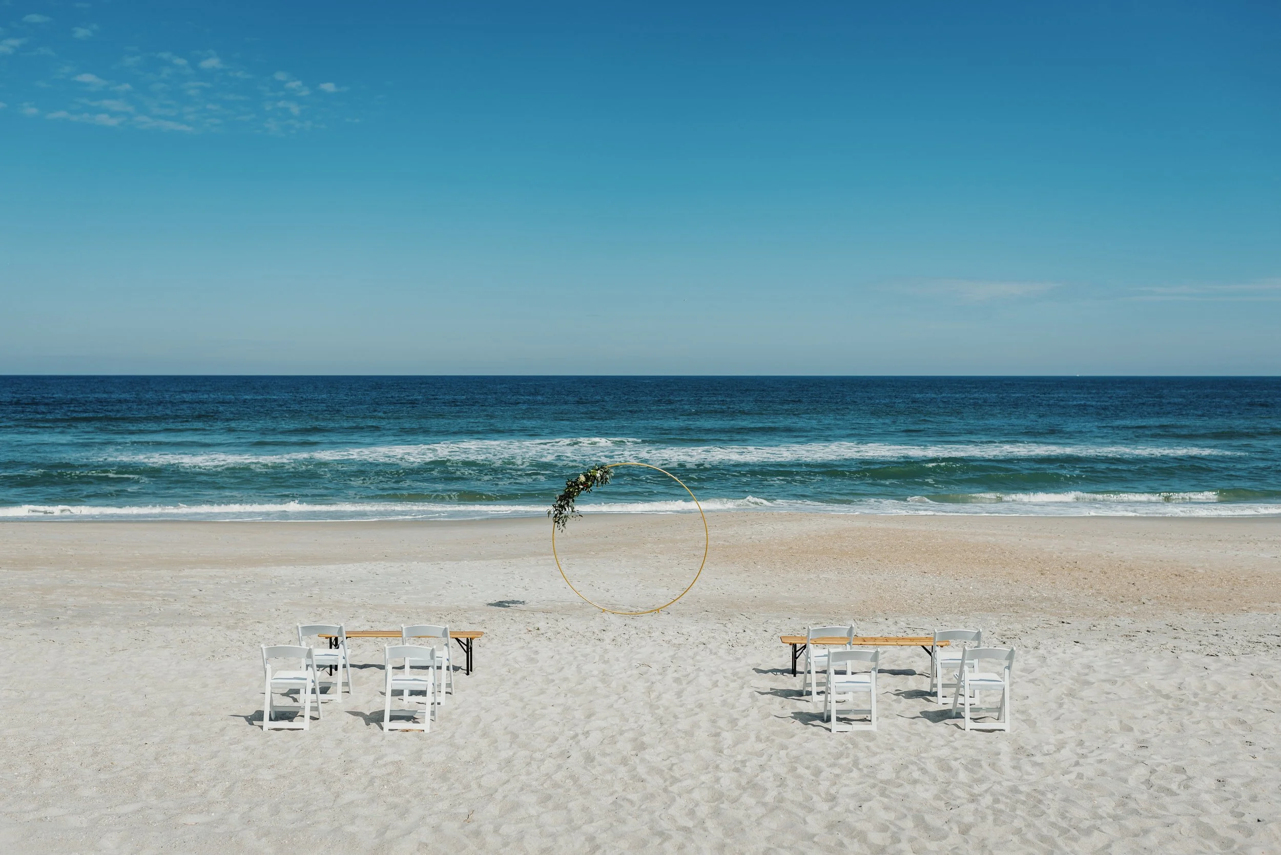 Beach wedding setup with chairs and circular floral arch facing the ocean. View fullsize